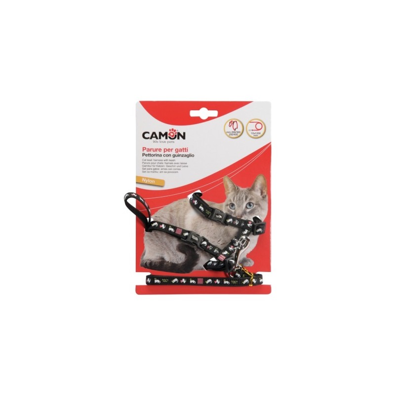 Harness with leash for cats, available in 3 different colors (red, blue and black) with a colorful pattern.Camon.Cat harness.